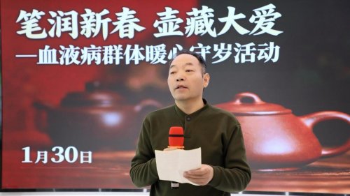 活动最后,江苏省中外社会文化交流协会苏州办事处主任徐宝鑫作总结发言。他表示,本次“笔润新春·壶藏大爱”活动是艺术之美与公益之善的完美交融,艺术家的无私奉献、企业的责任担当、各界人士的爱心助力,共同谱写了一曲温暖人心的公益赞歌。愿这份爱心能持续传递,陪伴血液病患者度过一个暖心安心的新春,更愿他们在新的一年里治疗顺利、早日康复,勇敢向阳而生。